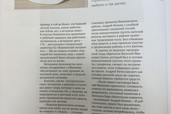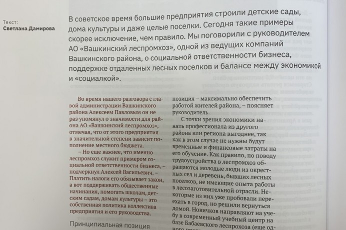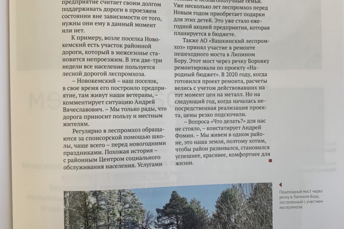В апреле 2022 года вышла публикация статьи «Социальная ответственность» в журнале «Грани». В интервью Генеральный директор АО «Вашкинский ЛПХ» Андрей Вячеславович Фомин рассказал, как формировалась социальная политика предприятия. Вашкинский леспромхоз предоставляет льготы сотрудникам на приобретение и строительство жилья, поддерживает семейные ценности, поздравляет с юбилейными датами ветеранов труда, помогает в трудной жизненной ситуации. Социальная политика предприятия не ограничивается его сотрудниками, леспромхоз активно участвует в общественной жизни Вашкинского района, выделяет финансовую помощь школе, дому культуры, общественным организациям, поддерживает жителей лесных поселков, строит и содержит лесные дороги.